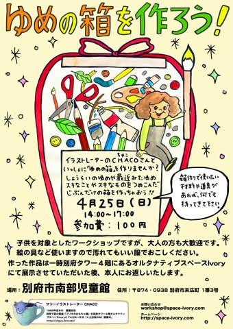 作った作品は一時別府タワー4階にあるオルタナティブスペースIvoryにて展示させていただいたあと、本人にお返し致します。