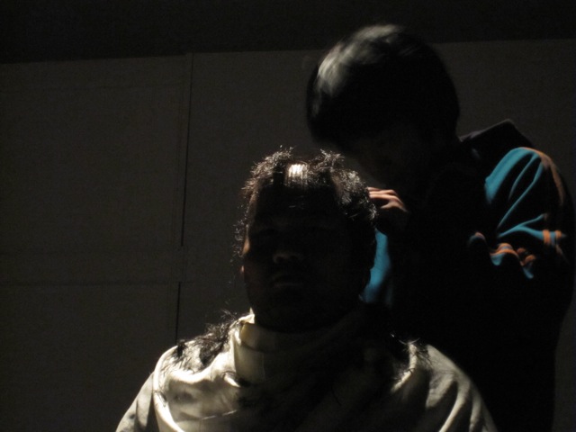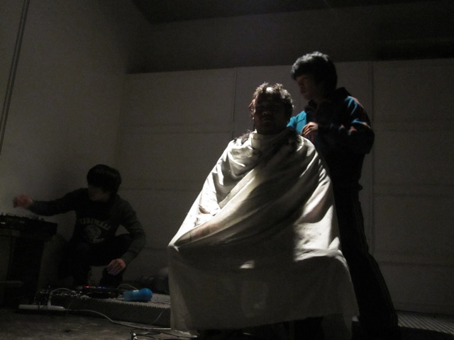 バリカンの先にマイクを取り付け、友人の頭を坊主にしていきます。